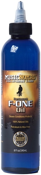F-ONE har en formula bestående av en blandning av de allra renaste trä- och fröoljorna för att rengöra, återfukta och skydda din greppbräda. Denna olja innehåller ingen citronolja, vax, petroleum destillat, silicon eller vatten eftersom just de ämnena kan orsaka oönskade bieffekter som t ex att på sikt torka ut greppbrädan. Med F-ONE kommer greppbrädan att bli fräsch, mjuk och skön att spela på, aldrig klibbig eller kladdig. Denna unika olja penetrerar och restaurerar träet samtidigt som det torkar snabbt vilket ger greppbrädan en ny lyster för en lång tid. F-ONE är första valet hos många instrumentverkstäder runt om i världen.