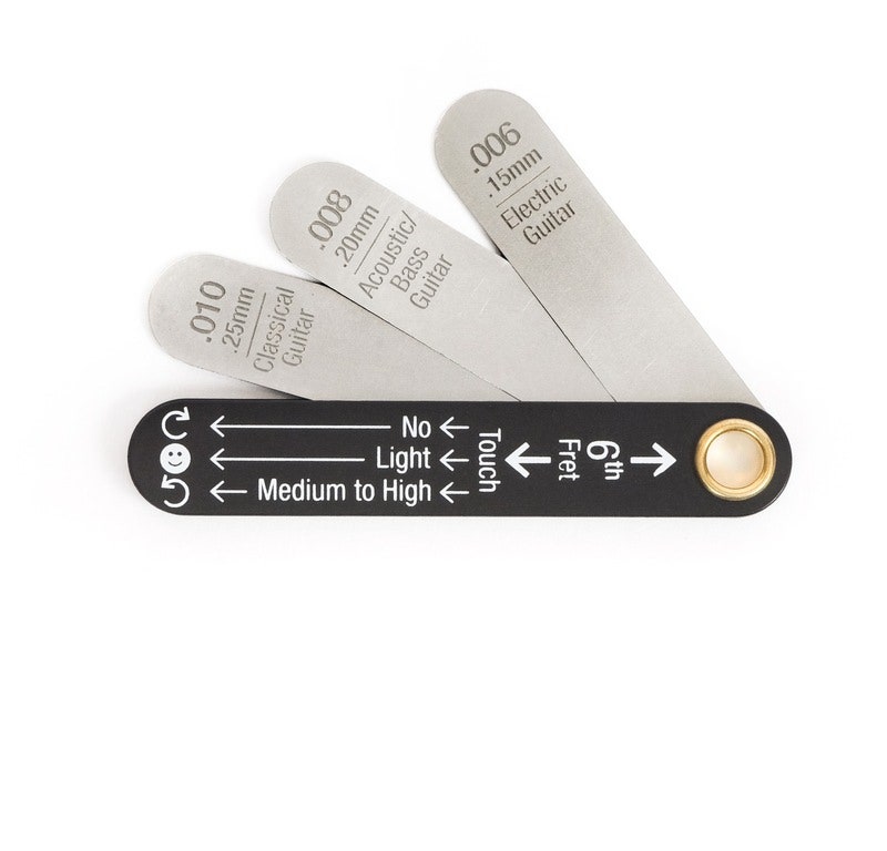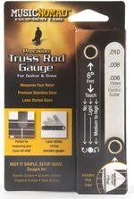 Att på ett korrekt sätt mäta hur halsen är spänd är ett viktigt moment när man justerar sitt instrument, för att veta att man har optimal stränghöjd. MusicNomad MN600 gör det snabbt och precist. Verktyget kommer med de tre vanligaste måtten för optimal spänning av halsen (.006”, .008”, .010”) och på handtaget finns instruktioner om du skall spänna eller släppa på halsen. Mätverktyget funkar lika bra för elgitarrer som akustiska gitarrer och elbasar. Själva måtten är tillverkade i stål och med verktyget så följer det även med en distans, formad som ett plektrum för att göra processen enklare.