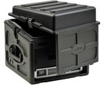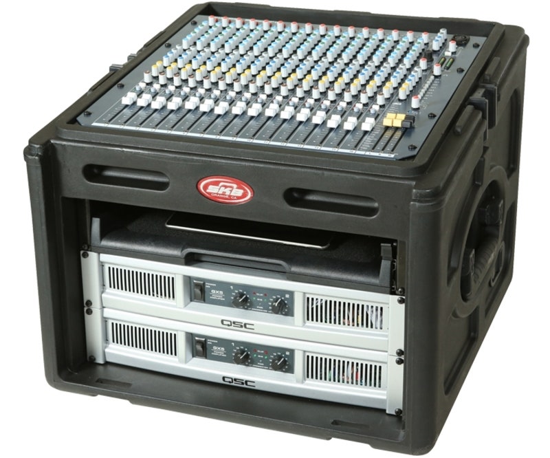 10HE för toppmontering samt 6HE på fronten för slutsteg och effekter etc. SKB-R106 har hårda lock och sidor samt lätt åtkomst av kablage via öppningsbara luckor på kortsidorna. Utrymme finns så att tillbehörshyllan AV-8 kan monteras även med locket stängt. (AV-8 säljs separat).