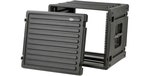 Helgjuten racklåda gjutna i tre delar; kropp, framsida och baksida. Handtagen är ingjutna i kroppen, hela racklådan vilar på stötdämpande gummifötter.