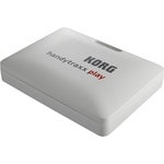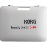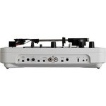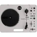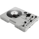 Bärbar skivspelare med högtalare. Drivs med ström-adapter eller batteri.