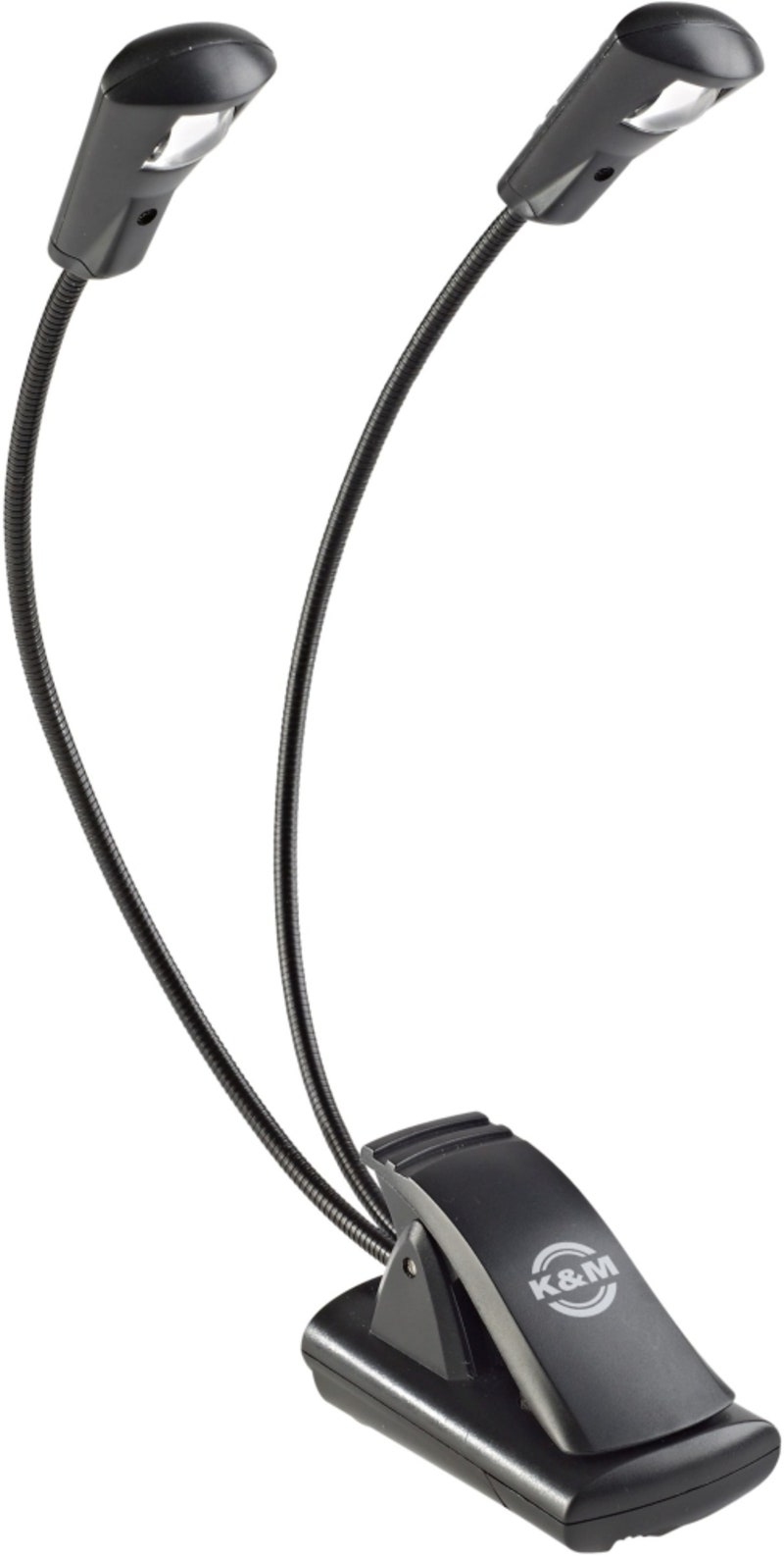 König & Meyer Music stand light "Double LED FlexLight" är en batteridriven LED-belysning som drivs med batterier. Du kan klämma fast den på material med en tjocklek på upp till 25mm eller ställa den på en bordsskiva om du vill ha den fristående. Passar bra till notställ eller på ett instrument men lika bra att fästa på en bok när du vill läsa i mörkret.