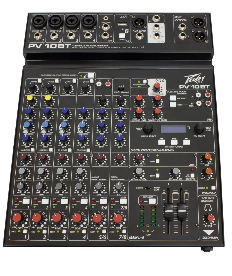 The PV 10 BT includes 4 channels of reference quality mic preamps, 4 direct outputs for recording, a stereo channel, media channel with Bluetooth® wireless input, high quality digital effects with LCD display, streaming USB out, MP3 playback via USB A input, Peavey's exclusive Kosmos® audio enhancement, 48-volt phantom power, dual selectable control room outputs, 2 channels of compression, one channel of on board selectable guitar preamp, 3-band EQ per channel with bypass, channel mute buttons, aux send, signal clip indicators, and a stereo master LED meter bridge. This amazingly versatile mixer is at home both in the studio as well as live applications.