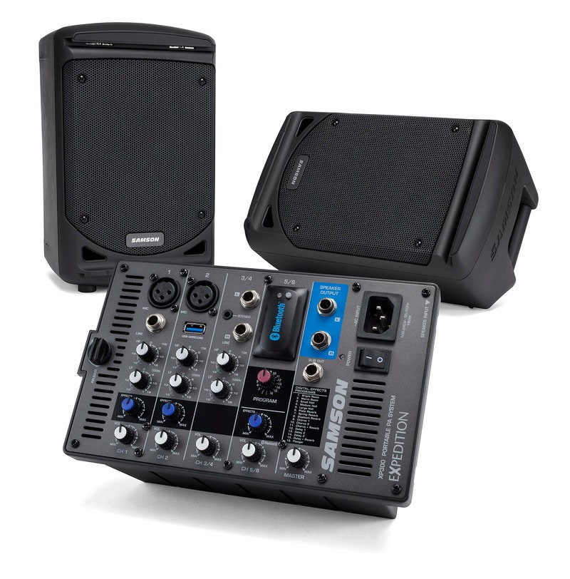 Samsons Expedition XP300 är ett allt-i-ett ljudsystem som erbjuder utmärkt ljudkvalitet med snabb och enkel installation. XP300 har en lätt, 6-kanalig mixer och två 6 "högtalare. För ökad bärbarhet erbjuder XP300 en unik högtalarlåsande design som gör att systemet och alla dess delar kan packas upp och transporteras som en enda enhet.