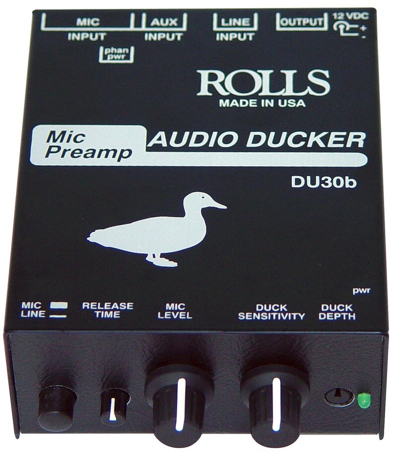 Mikrofonförstärkare med ducker-funktion som sänker signalen från RCA-ingången vid signal från XLR-ingången eller RCA Aux-ingången.
