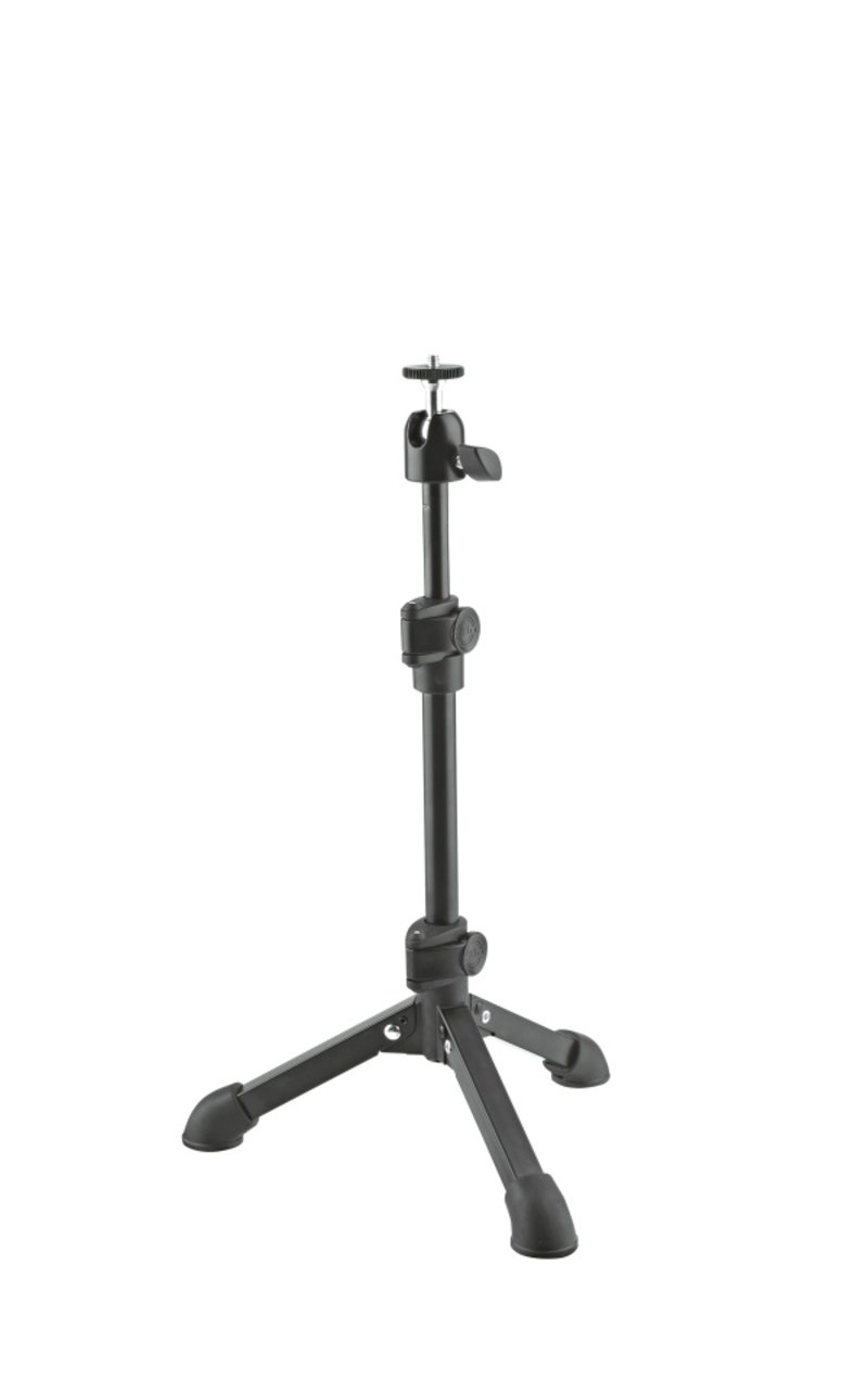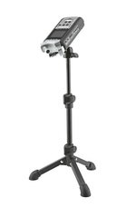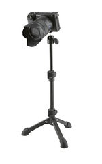 Useful desktop camera stand for mounting compact cameras, action cameras, web cams, mini-projectors and mobile recorders with a 1/4" connection thread. The ball joint allows the mounted equipment to be rotated 360° and fixed in any position. The height can be freely adjusted from 280 mm to 488 mm via two clamping levers. The tilt-angle is infinitely adjustable up to 90° and the load capacity is designed for equipment up to 1 kg. For transport, the tripod folds compactly to save space.