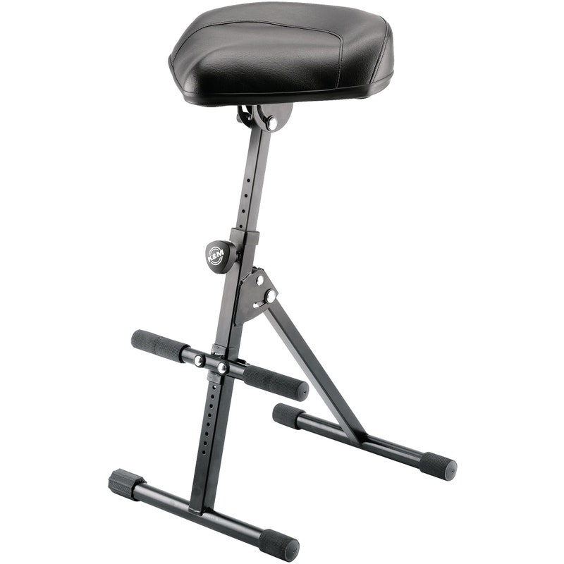 K&M 14045 har justerbar höjd i flera steg mellan 650 - 930mm, en formad sits klädd i konstläder och passar utmärkt till ex. keyboardisten, gitarristen eller slagverkaren som behöver sitta men även har behov av att komma högt upp.