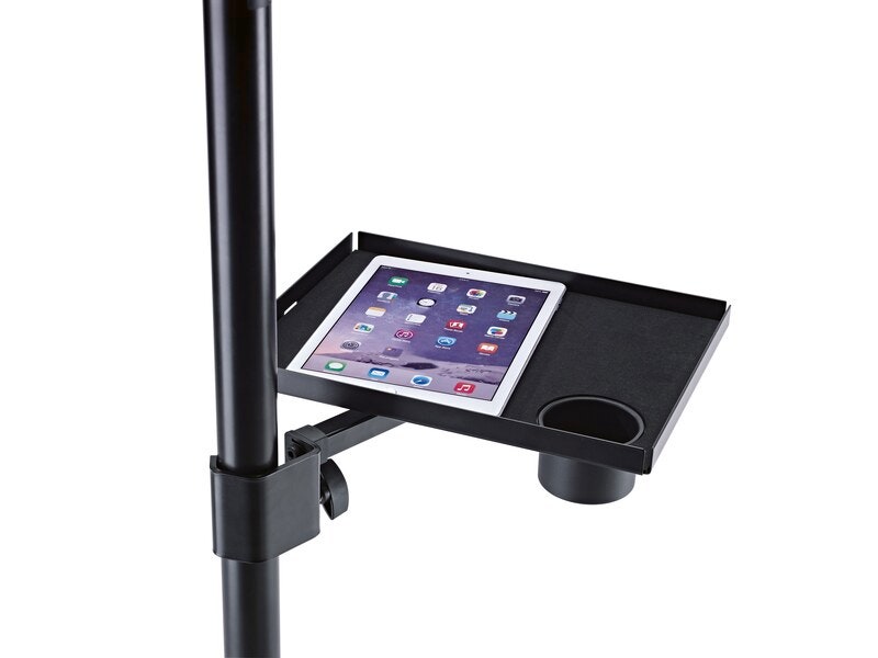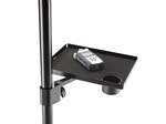 Practical tray that can be attached to all stands with a tube diameter of 25 to 42 mm. The usable tray area is 250 x 330 mm and is ideal for smaller electronic devices such as mixers, controllers or tablets. An additional recess in the plate ensures convenient cable routing. Another useful feature is the can/cup holder. The robust steel construction is ideal for percussion and other music accessories. A foam insert dampens vibrations and prevents unpleasant background noises. The distance to the stand as well as the orientation of the plate can also be individually adjusted.