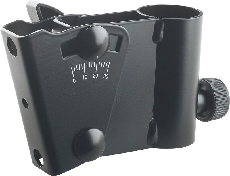 Högtalarfäste med skruvinfästning för 35 mm stativrör. Vinklingsbart höjdled 0-30 grader.